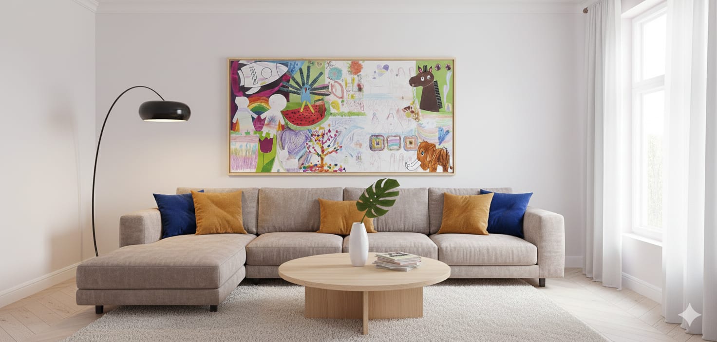 Premeňte detské výtvory na umenie! Namiesto škatúľ detských obrázkov doma - štýlová koláž v podobe moderného obrazu. Viac o detskej koláži na mieru sa dozviete tu.