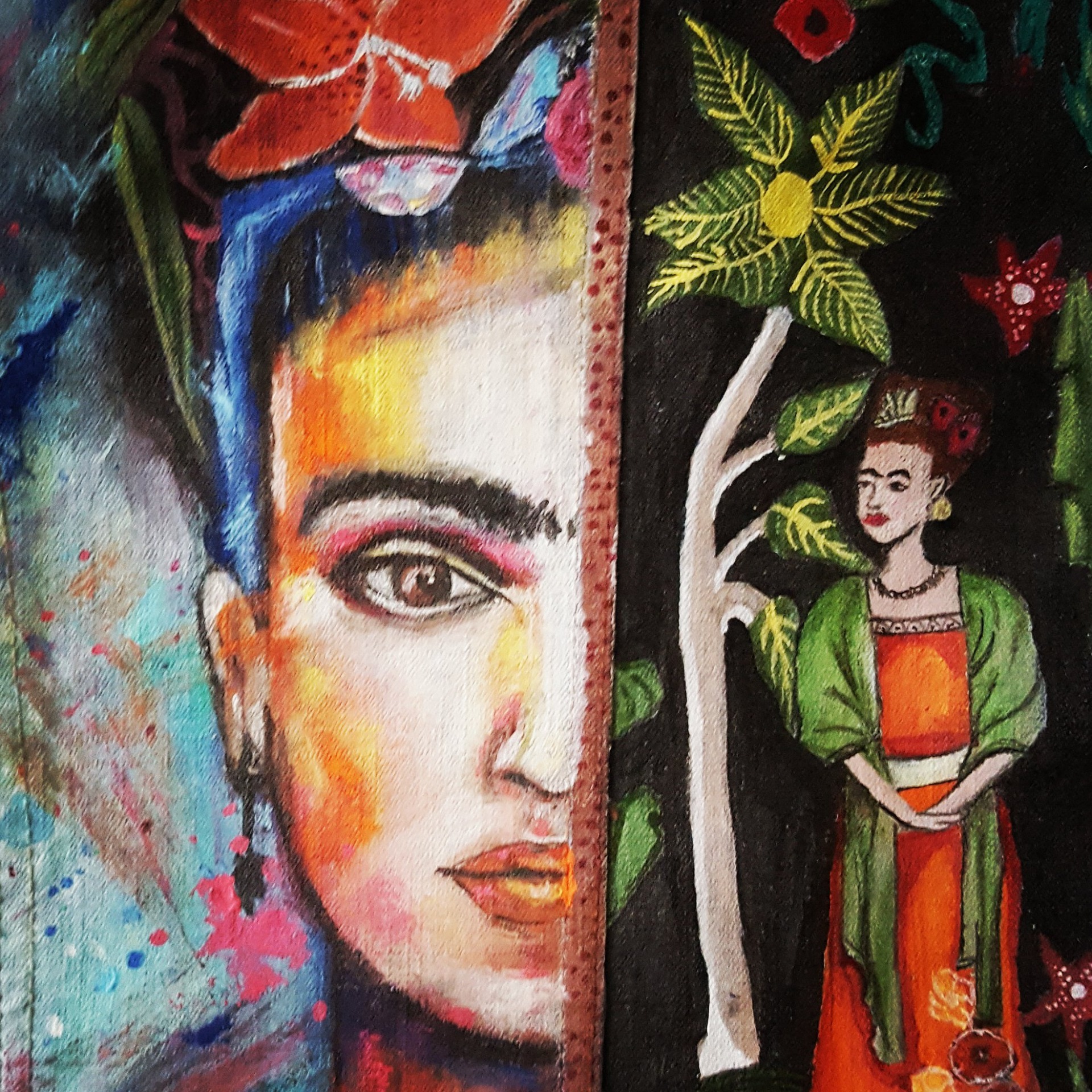 Ručne maľovaná rifľová bunda s námetom nesmrteľnej Fridy je originálna, rovnako ako jej inšpirácia. Tento fashion kúsok hrá farbami, spája v sebe rozličné vzory a obrázky, ktoré robia dojem osobitne, aj vo vzájomnom kontexte. Bunda je retro strihu aj farby, čo predstavovalo ideálne "plátno" na ďalšie umelecké tvorenie smerom k legendárnej maliarke. Bunda je rovného strihu a rukávy sú širšie, trojštvrťové. Bunda má zaujímavé hlavné obrázky i menšie detaily.