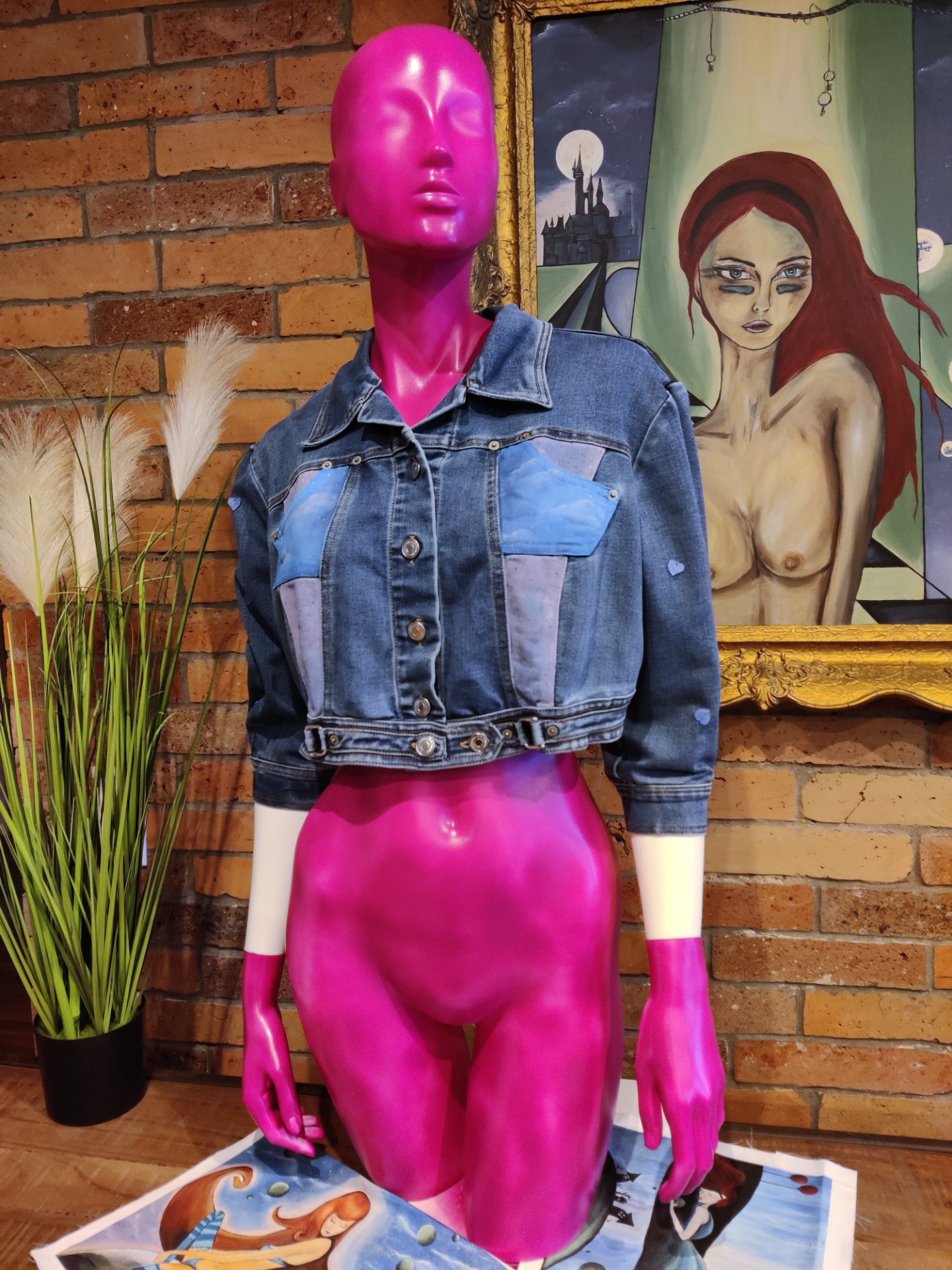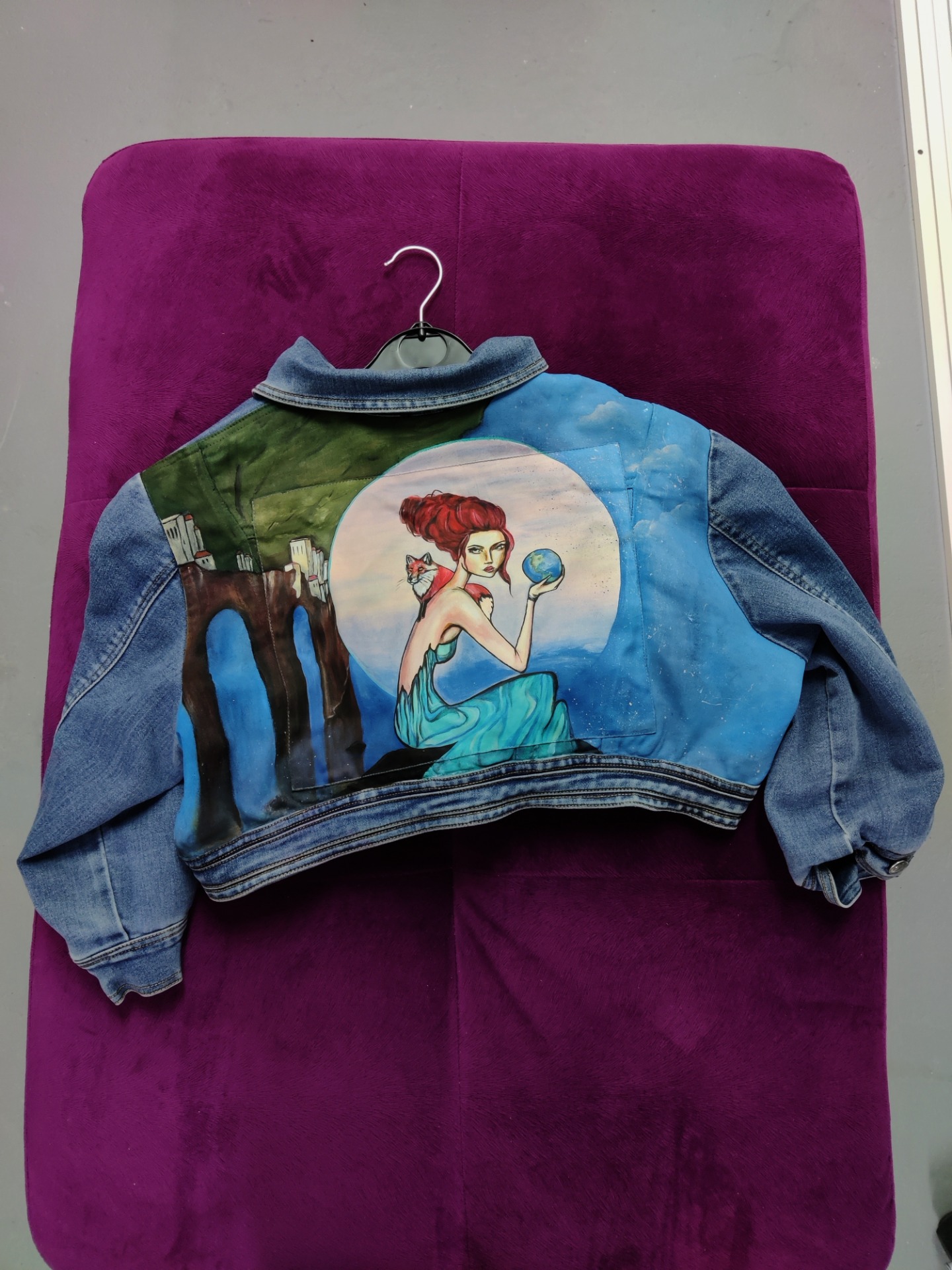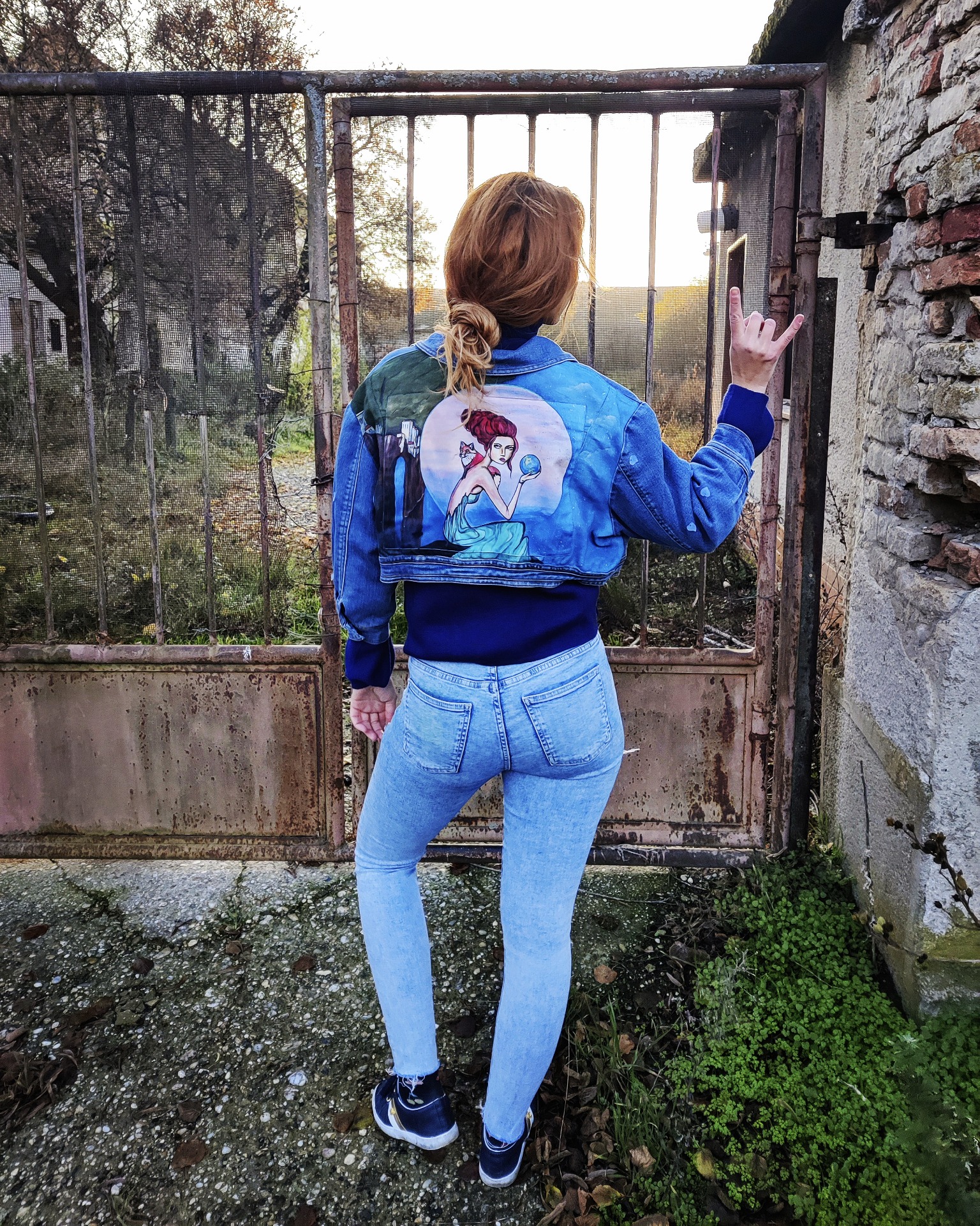 Maľovaná rifľová bunda je dostupná len ako 1 ks. Každý dizajn je jedinečný. Ide o upcyklovaný kus oblečenia, ktorému bol vdýchnutý nový život.