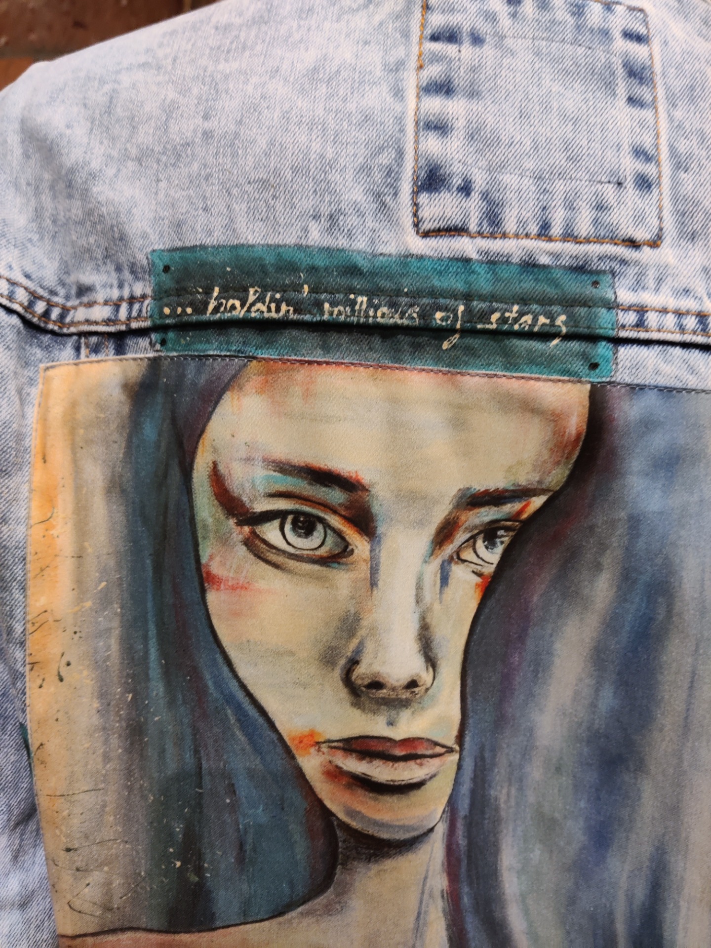 Maľovaná rifľová bunda, je doplnená art prvkom v podobe dominantného autorského obrazu, vytlačeného na látku. Obraz je doplnený vlastnoručnou maľbou na textil, ktorá pokračuje po zadnej strane. Toto rifľovej bunde dodáva art šmrnc. Tento kúsok je kombináciou nesmrteľnej klasiky, v podobe rifľoviny a originálneho umenia. Taká je ART bunda Layla I, ktorá je inšpirovaná Snovou kolekciou obrazov, z dielne DOMI GABRIEL ART.