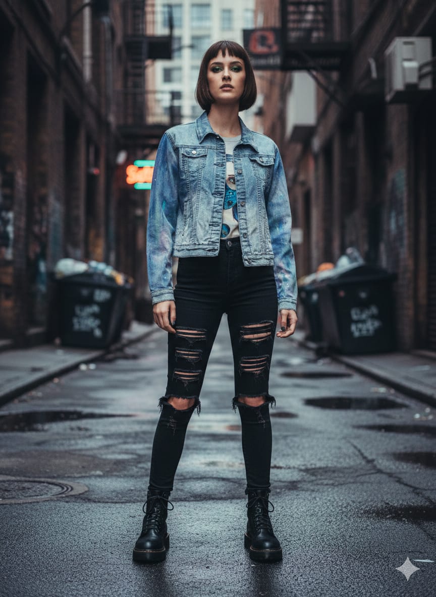 Maľovaná rifľová bunda, je doplnená art prvkom v podobe dominantného autorského obrazu, vytlačeného na látku. Obraz je doplnený vlastnoručnou maľbou na textil, ktorá pokračuje po celej dĺžke rukávov, ktoré sú umelecky "zafŕkané" až do prednej časti bundy. Toto rifľovej bunde dodáva art šmrnc. Tento kúsok je kombináciou elegantného a klasického na jednej strane a originálneho a jedinečného na tej druhej. Taká je ART bunda New World I, ktorá je inšpirovaná Snovou kolekciou obrazov, z dielne DOMI GABRIEL ART.