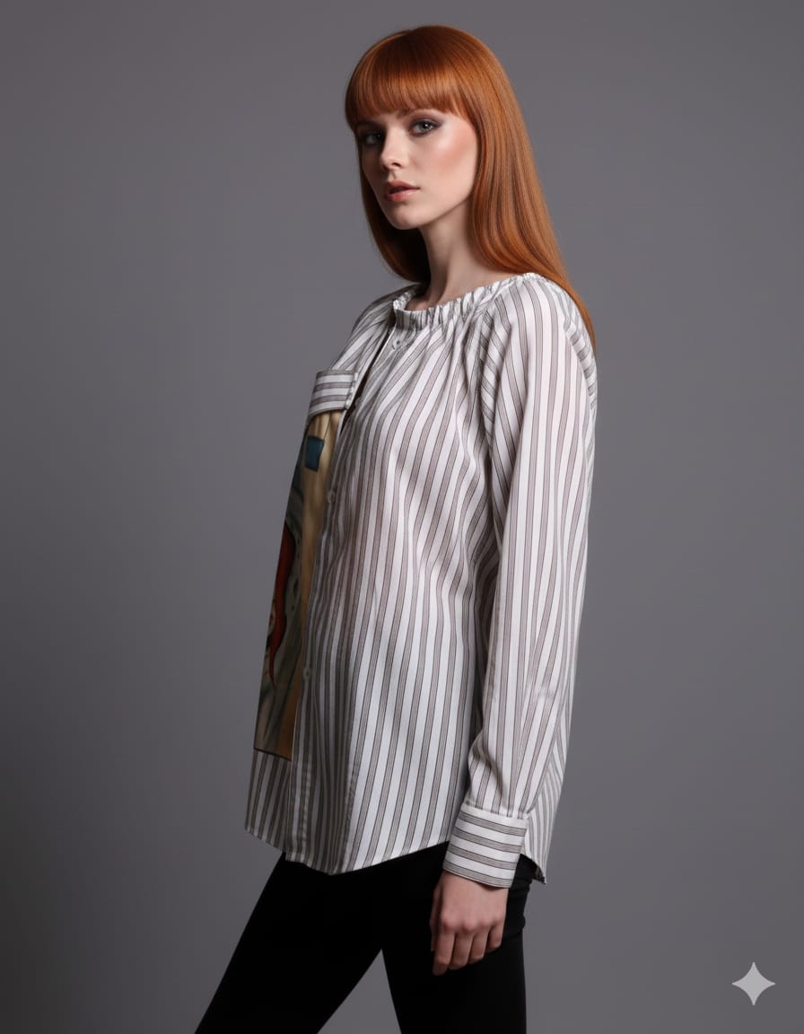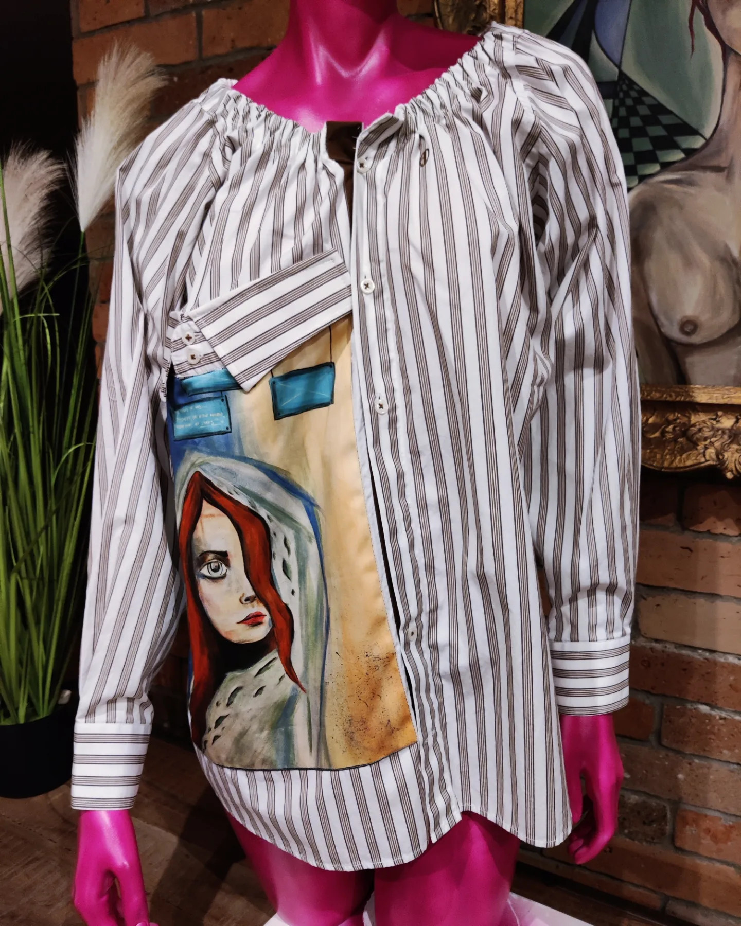 Žensky zvodná oversized košeľa, s odhalenými ramenami, je doplnená art prvkom v podobe dominantného autorského obrazu, vytlačeného na látku. Tento kúsok je kombináciou elegantného a klasického na jednej strane a originálneho a jedinečného na tej druhej. Taká je ART košeľa oversized Lara I, ktorá je inšpirovaná Snovou kolekciou obrazov, z dielne DOMI GABRIEL ART.
