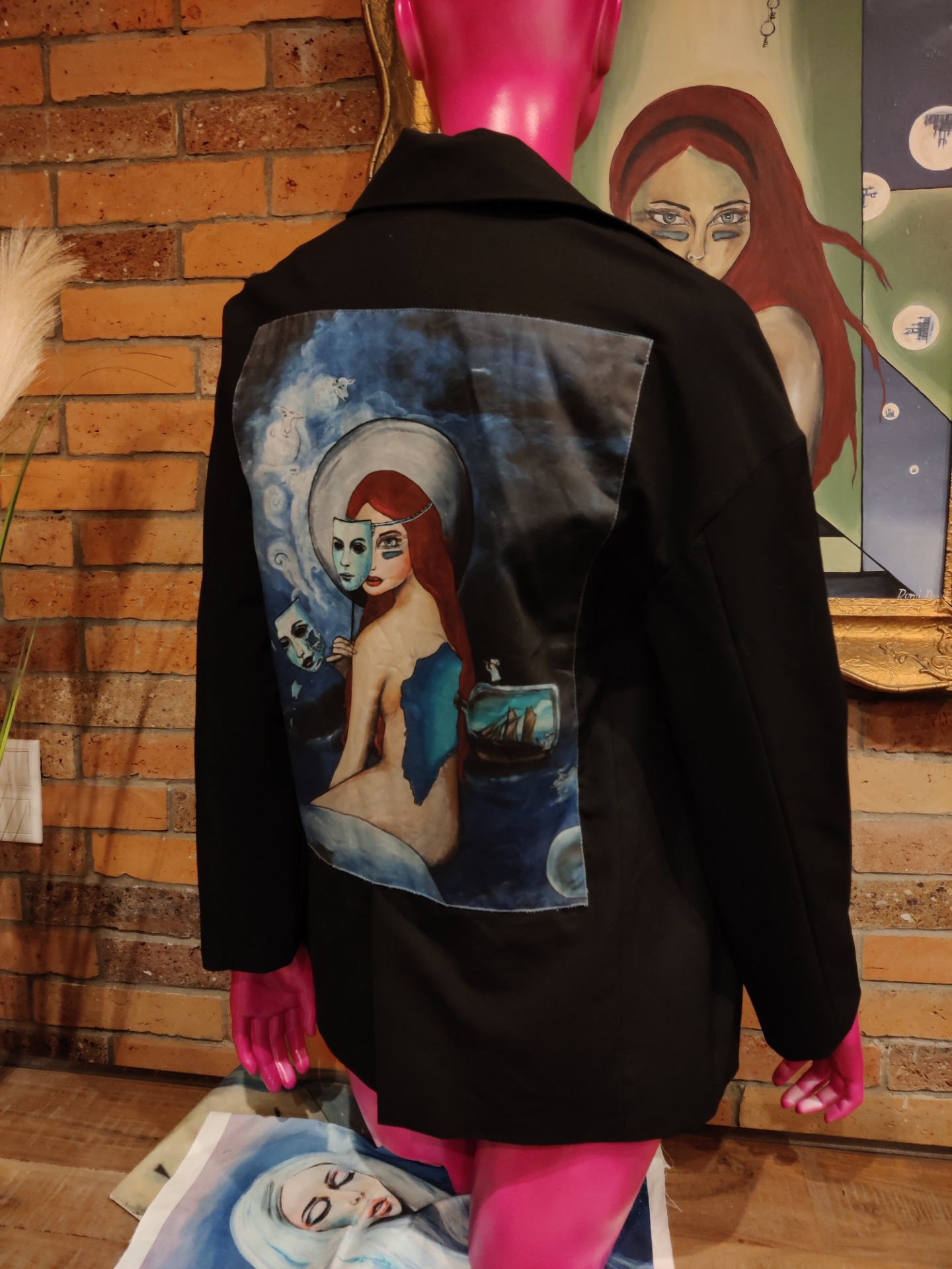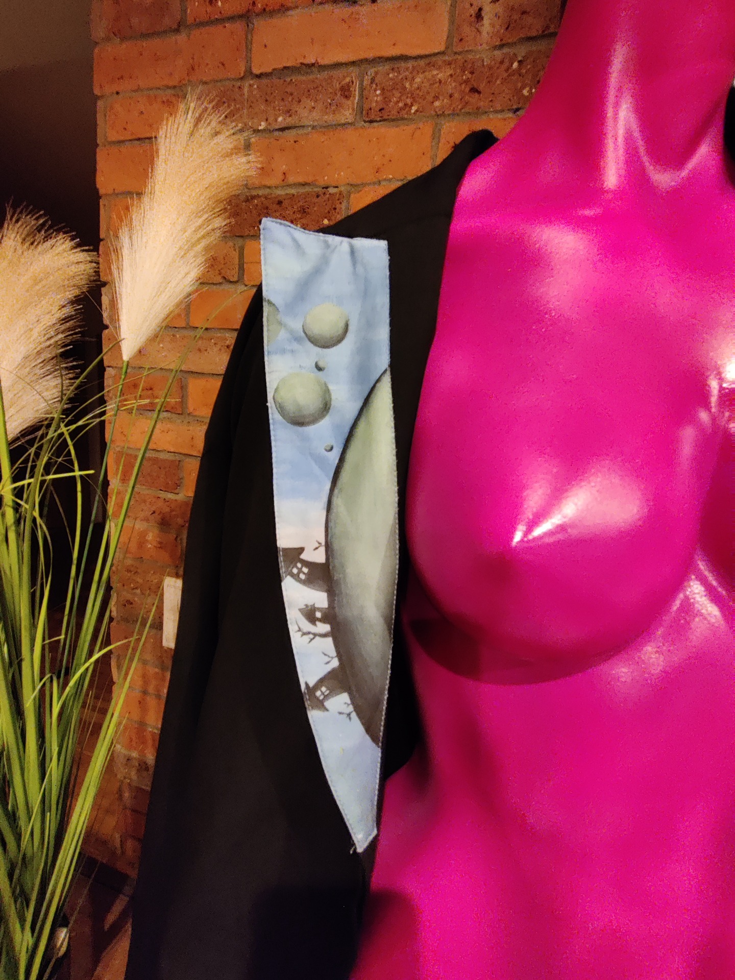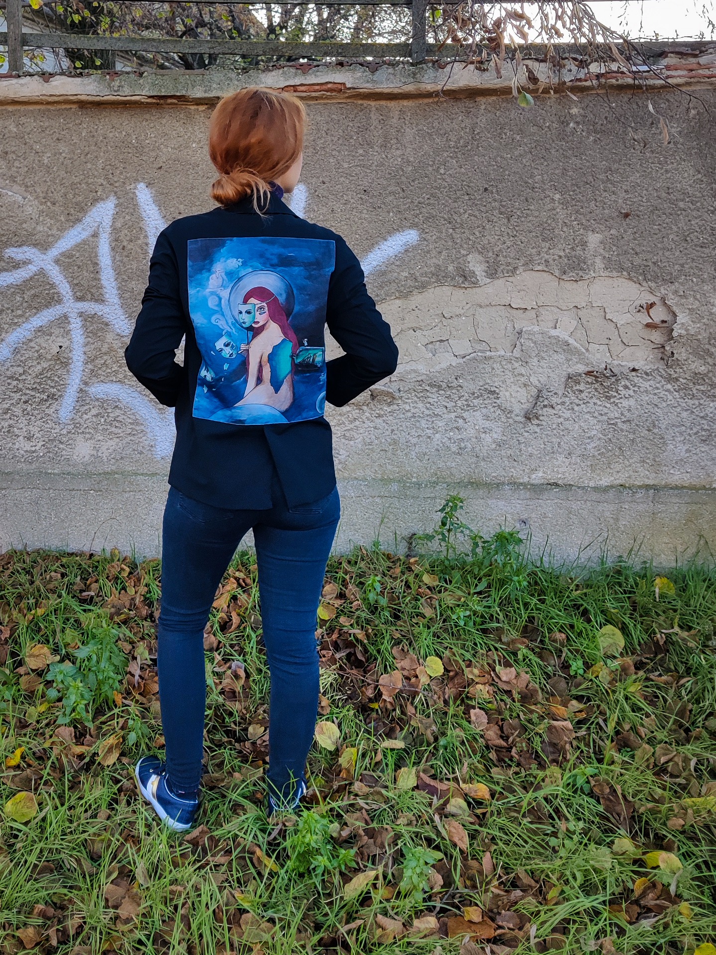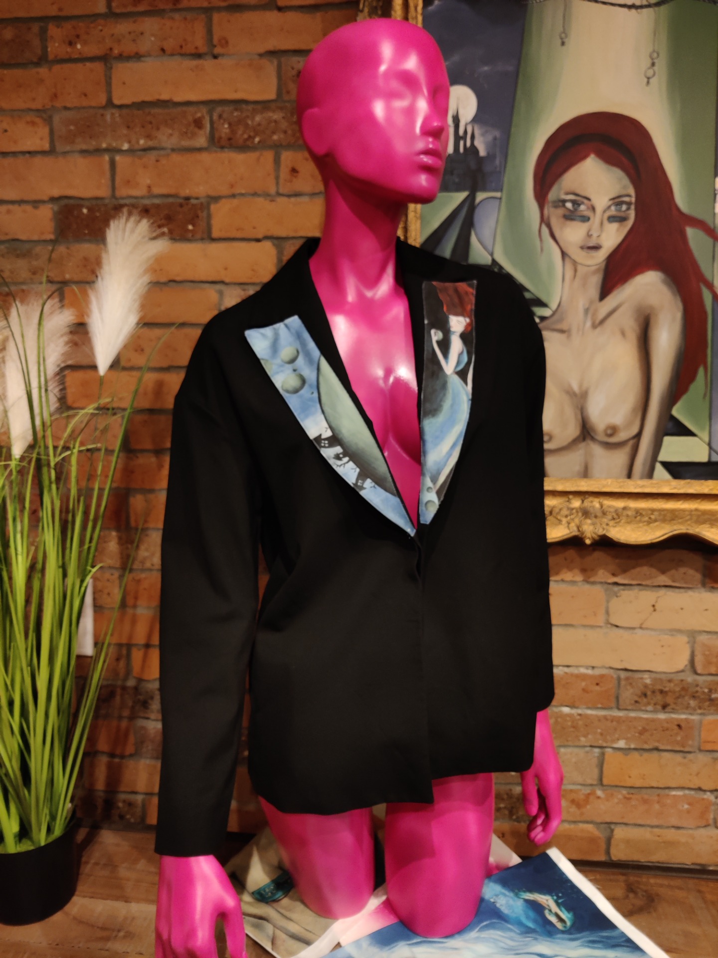 Elegantné sako, klasického strihu, vo formálnej čiernej farbe, je doplnené art prvkami v podobe dominantného autorského obrazu a menších obrazov, v oblasti lemu saka, ktoré sú vytlačené na látku. Tento kúsok je kombináciou elegantného a klasického na jednej strane a originálneho a jedinečného na tej druhej. Také je ART sako Sleeping beauty, ktoré je inšpirované Snovou kolekciou obrazov, z dielne DOMI DEAN ART. Sako je strihovo určené pre útlejšie typy postáv. Pre presnú predstavu sa prosím riaďte nižšie uvedenými rozmermi.