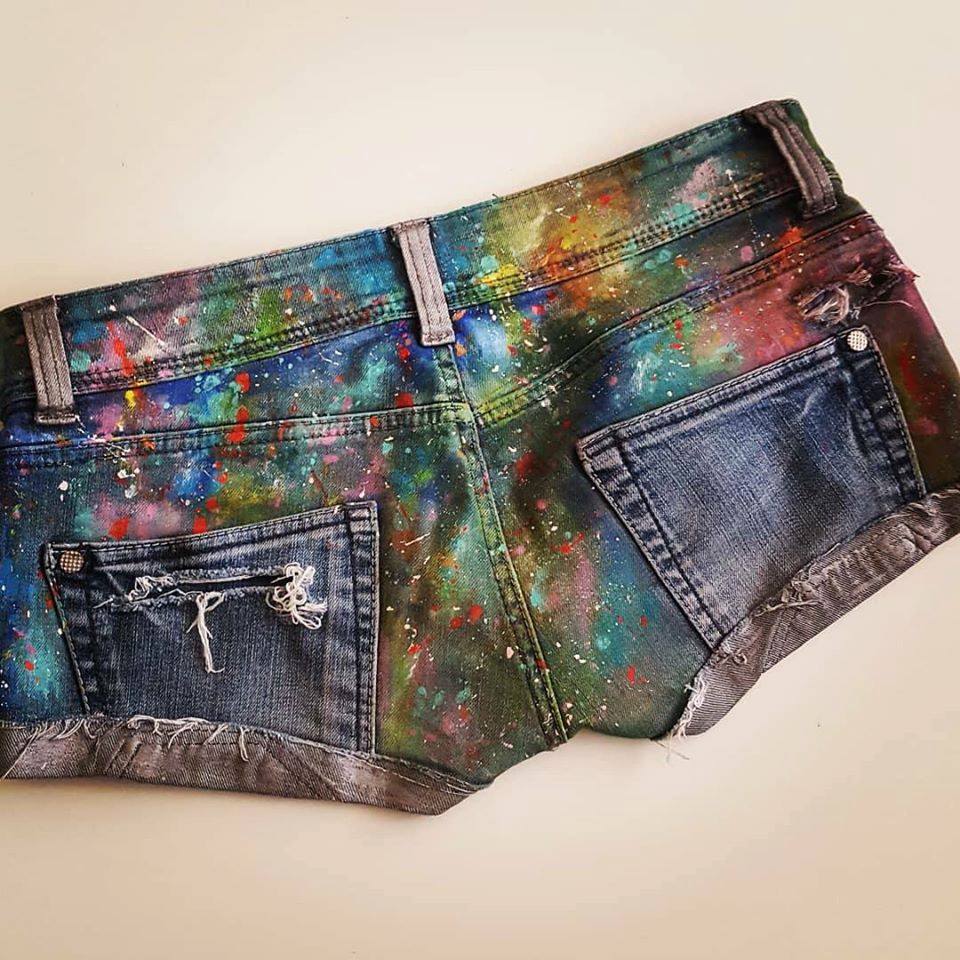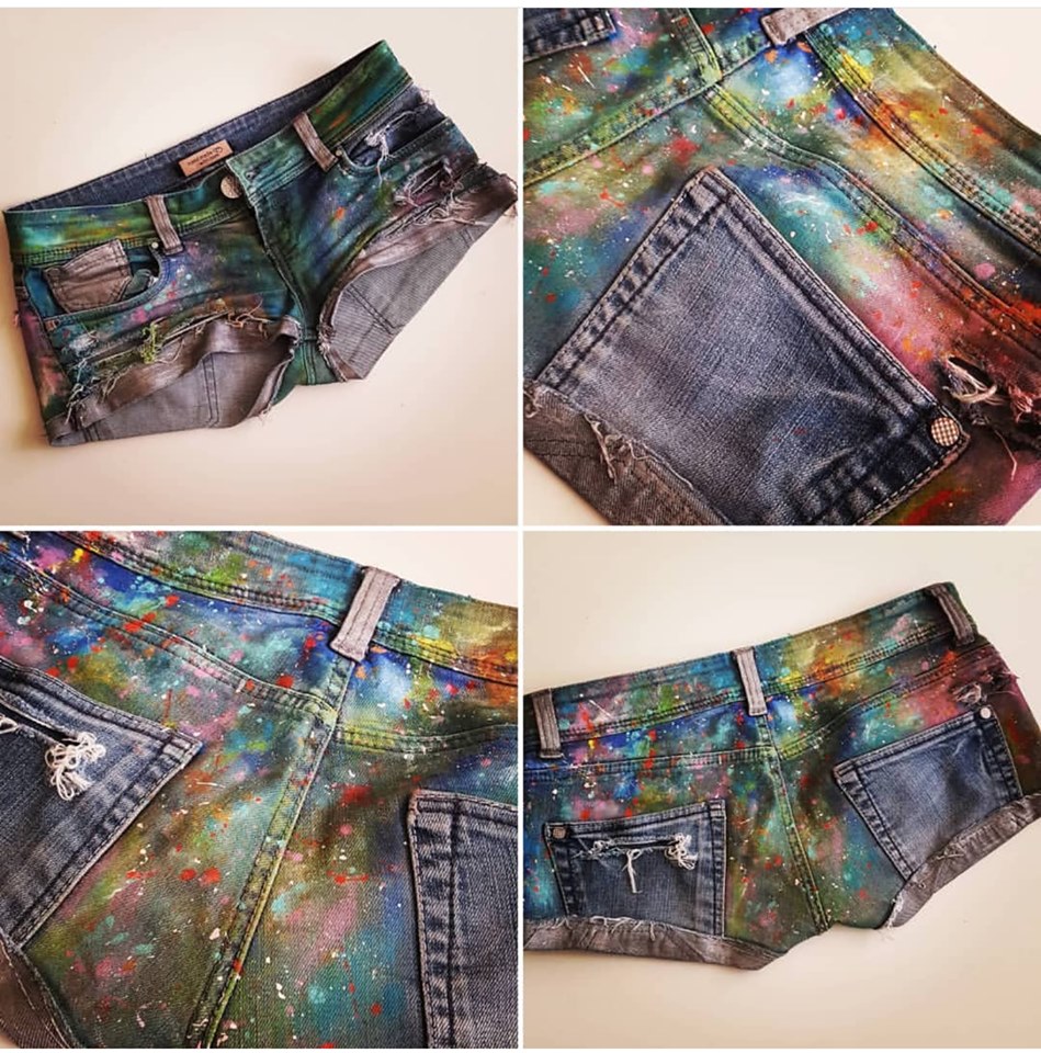 Maľované krátke nohavice sú dostupné len ako 1 ks. Každý dizajn je jedinečný. Ide o upcyklovaný kus oblečenia, ktorému bol vdýchnutý nový život.