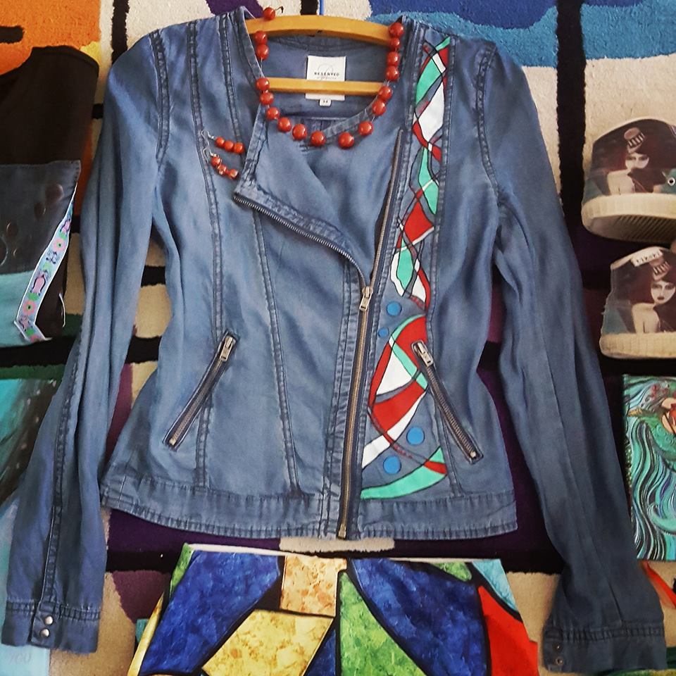 Maľovaná rifľová bunda je dostupná len ako 1 ks. Každý dizajn je jedinečný. Ide o upcyklovaný kus oblečenia, ktorému bol vdýchnutý nový život.